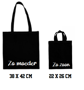 Katoenen tasjes voor groot en klein! Zelf een leuke tekst op een tas en eventueel matchen met je (klein)zoon, (klein)dochter, nichtje of neefje? Dat kan natuurlijk ook! Ik heb twee maten beschikbaar. Kies een tekst van de voorbeelden of een leuke eigen tekst voor op het tasje en straal als nooit tevoren.